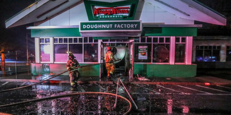 Photo: Firefighters extinguish a fire last year at the landmark Krispy Kreme Doughnuts store owned by basketball Hall-of-Famer Shaquille O’Neal. (John Spink/Atlanta Journal-Constitution via AP)