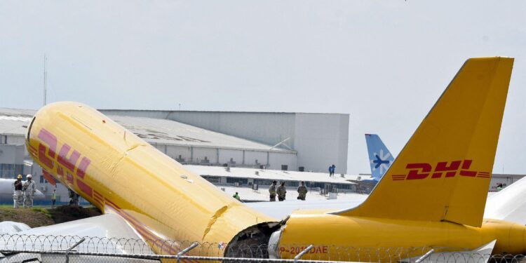 Multiple videos posted on social media purported to be of the landing showed an aircraft in DHL’s yellow livery touching down and rolling along the runway. It then made an abrupt right turn as what appeared to be smoke trailed its left main landing gear.