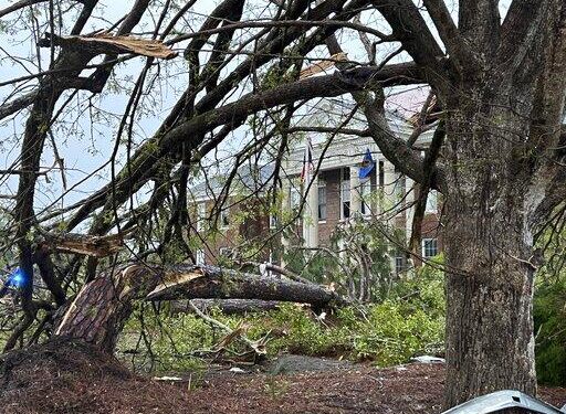 Photo: The Bryan County Courthouse was damaged and trees broken in half, Tuesday, April 5, 2022, after a storm passed through the city of Pembroke, Ga., 30 miles from Savannah, Ga. (AP Photo/Lewis M. Levine)
